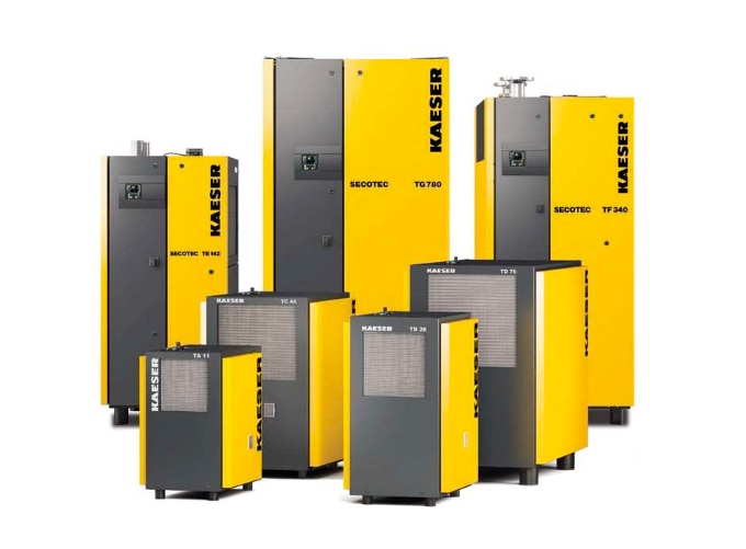 REFRIGERATION AIR DRYERS The SECOTEC® System In developing the SECOTEC dryer range, KAESER's goal was to produce a system that consumed minimal energy and which would provide optimal reliability and user friendliness. The resulting SECOTEC system from KAESER KOMPRESSOREN fulfils all of these requirements and, in contrast to most refrigeration drying systems, uses a highly efficient cycling system: SECOTEC Control. Therefore, the dryer's refrigeration circuit consumes power only when necessary. Designed and built by KAESER As one of the world's foremost compressed air system providers and manufacturers, KAESER ensures that every SECOTEC dryer provides exceptional performance. Each unit is built in accordance with the very highest quality standards at the KAESER Gera plant and undergoes stringent quality inspection as per KAESER's Quality Management System. TG -TI SERIES REFRIGERATED TYPE Energy-saving dryers from Kaeser Kompressoren enable significant savings all day, every day. For example, at 40 % airflow they consume only 43 % of their nominal energy requirement. This saves several thousand Euros in energy costs compared with conventional dryers. SUPER EFFICIENT REFRIGERANT COMPRESSOR The newly developed refrigerant compressor is able to regulate the volume of refrigerant that circulates within the refrigeration circuit in such a way that it also reduces the compressor's power consumption. Electrical power is therefore consumed only when actually drying air. INDUSTRIAL QUALITY CONTROL CABINET Every KAESER energy-saving dryer is EN 60204-1 compliant and is tested for electromagnetic compatibility in accordance with applicable EMC standards. Unlike equipment conforming to VDE 0700, TG-TI series refrigeration dryers conform to strict industrial standards. PREMIUM QUALITY PLATE HEAT EXCHANGER The air/air and air/refrigerant stainless steel plate heat exchangers were specially developed for use in refrigeration dryers. Generously sized copper piping not only ensures minimal pressure drop, but also saves energy.